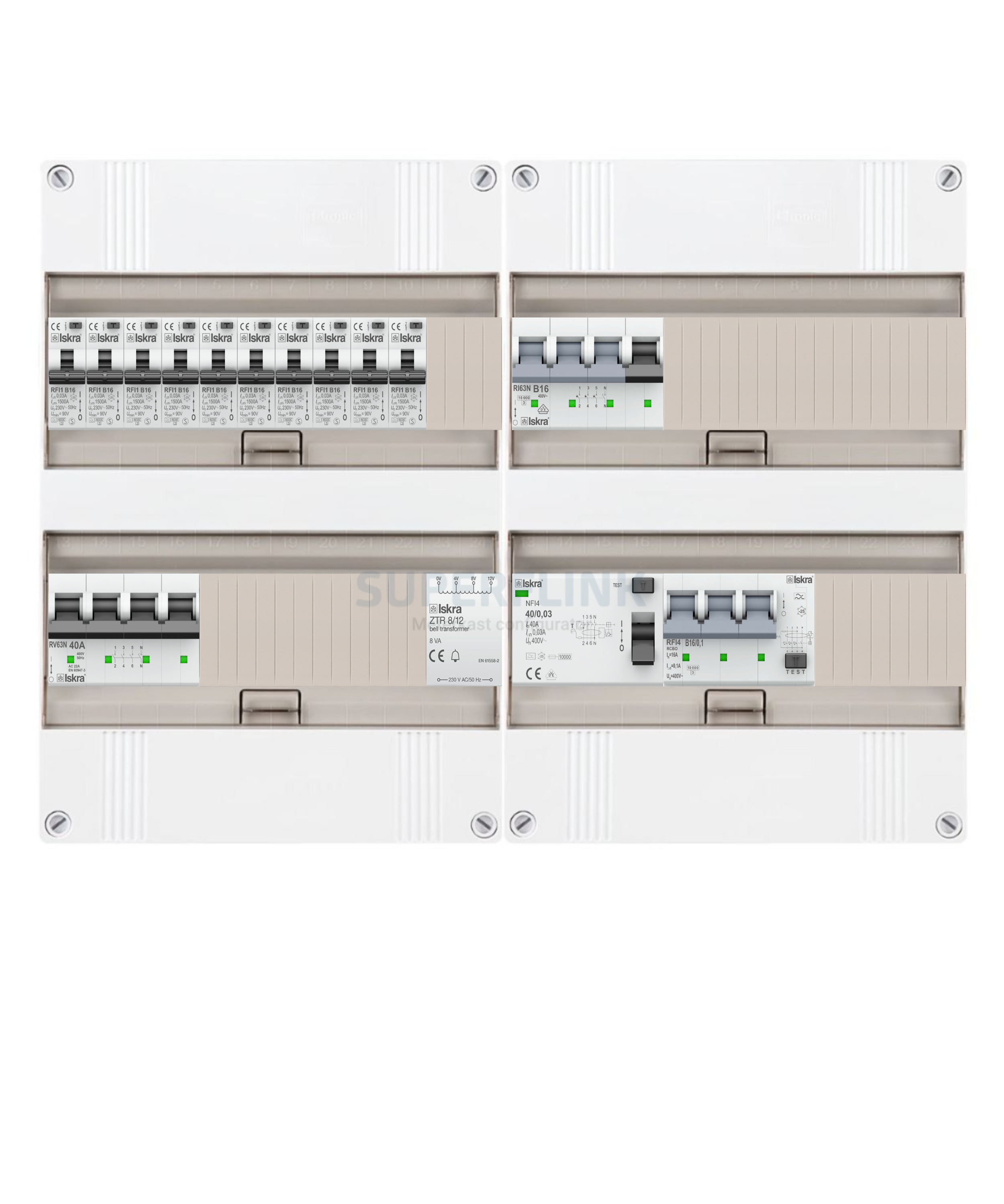 - 1 x Aardlekschakelaar Iskra NFI4-40-30 3 fase +nul 40A 30mA Type A 10kA